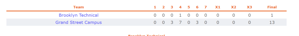 Grand Street High School scored seven runs in the fourth inning. I Mercedes, S Torres, R Rodriguez, E Polanco, and C Martinez all drove in runs in the frame.
