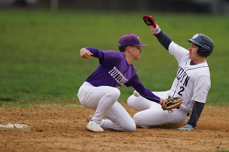 Julian Ashley gets the forceout at second, as Nico Harvey looks on, during Tottenville contest