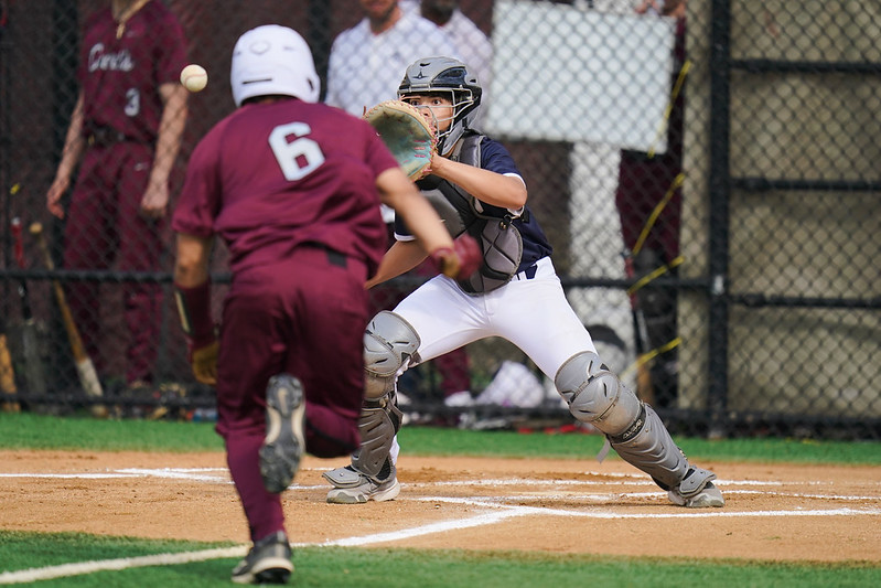 Catcher Andres Carson gets ready to apply the tag in close match vs. Curtis