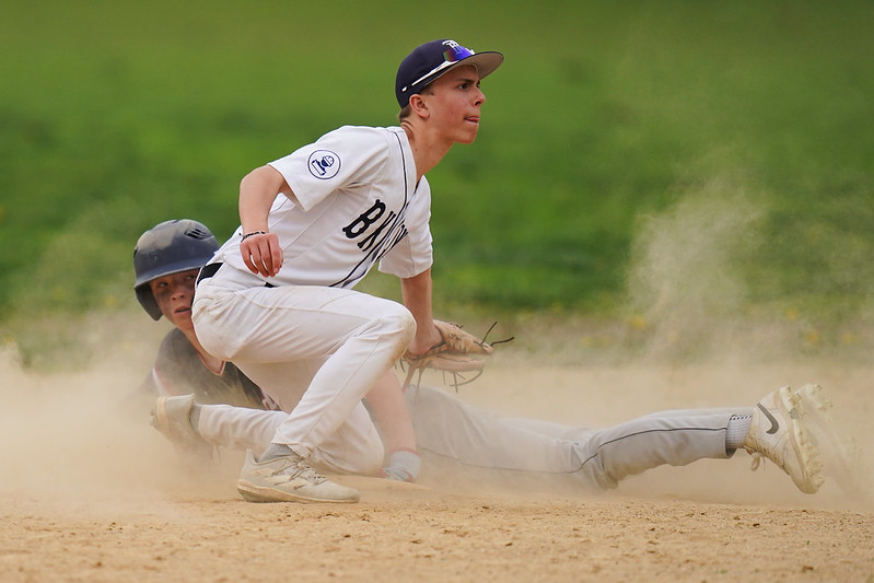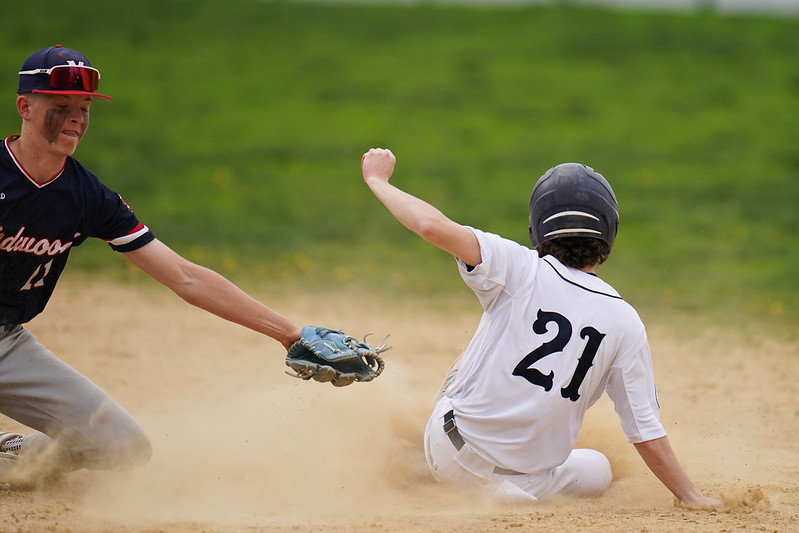 Pinch runner Finn Adomanis is safe at second vs. Midwood