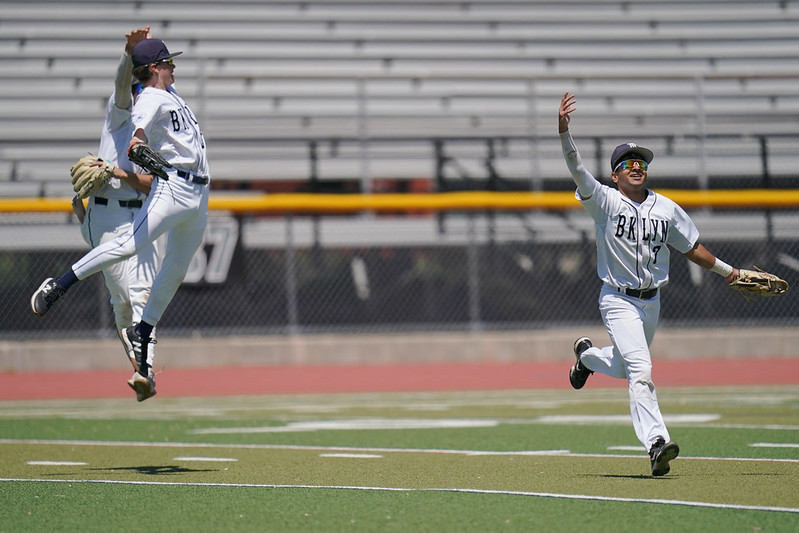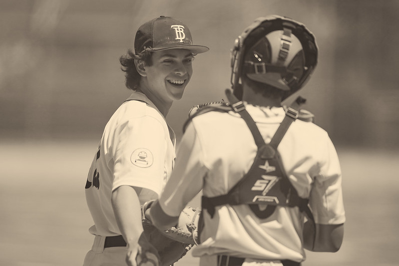 Tech ace Jake Rapoport checks in with catcher Andres Carson during New Dorp game [All photos by Vera Nieuwenhuis] https://www.flickr.com/photos/btechbaseball/albums/72177720326109679/