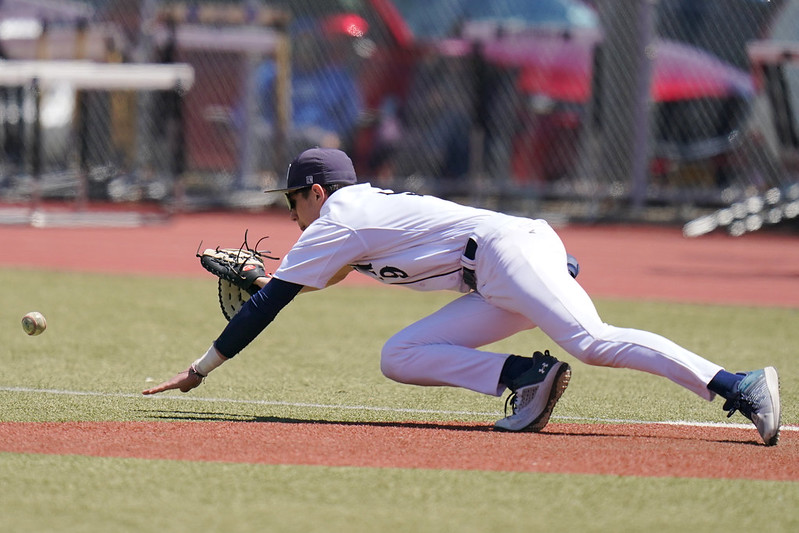 Trevor Nieuwenhuis dives for the ball at first vs. New Dorp