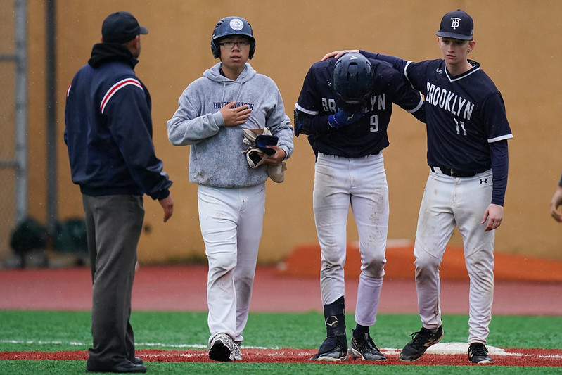 Jake Rapoport seeking a towel to dry off wet baseball during playoff action in South Bronx